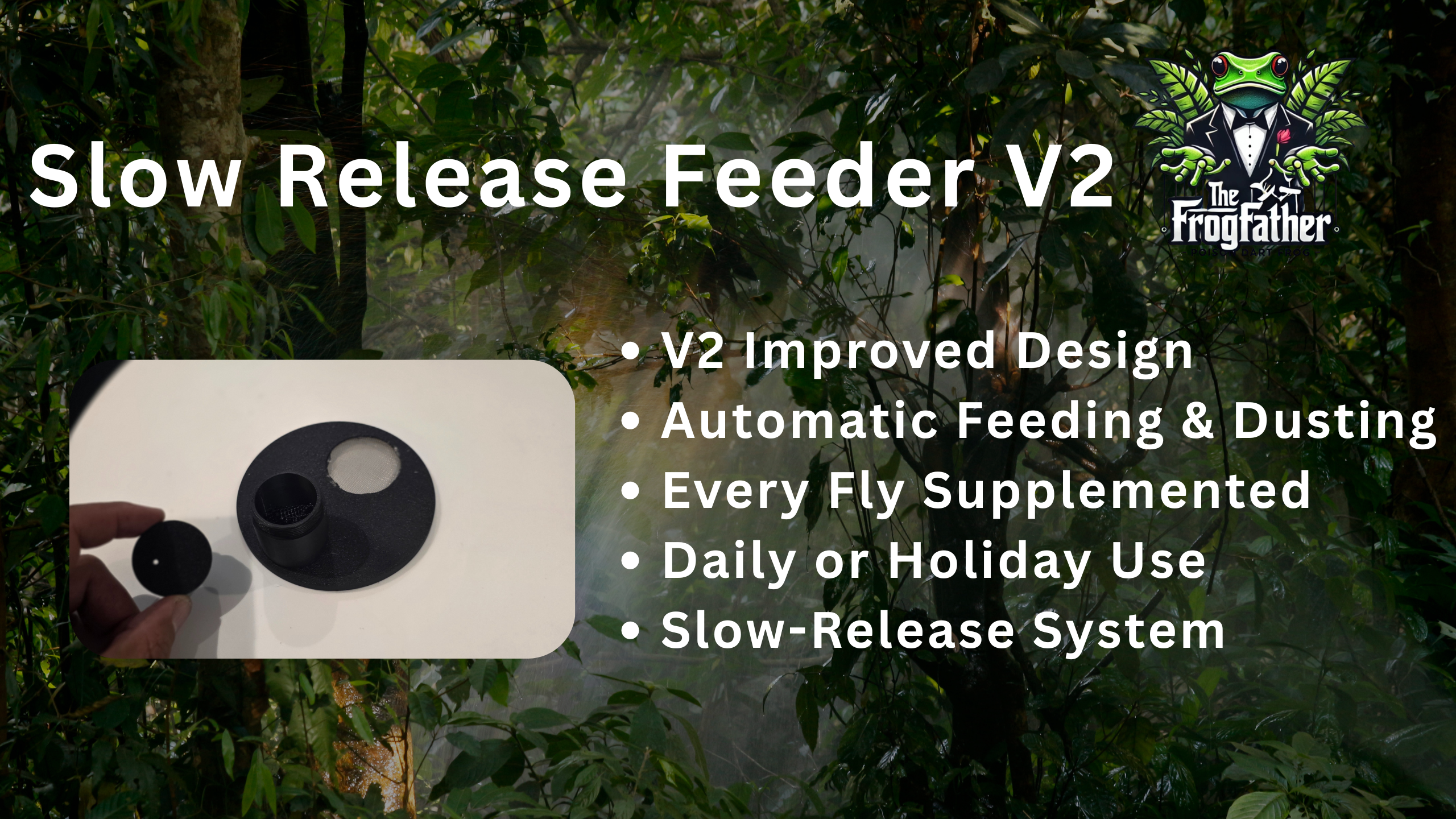 The Frogfather V2 Self-Dusting Fruit Fly Feeder is a hands-free feeding and supplementing system designed for tropical terrariums, tree frogs, and other micro-insect feeders. Built on keeper feedback and real-world use, Version 2 improves reliability, flow control, and dusting consistency — keeping your frogs fed, dusted, and healthy even when you’re not around.